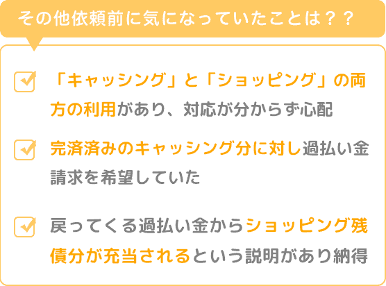 完済済みのキャッシング分に対し過払い金請求を希望していたのですが、この場合は戻ってくる過払い金からショッピング残債分が充当されるという説明があり、納得できました。