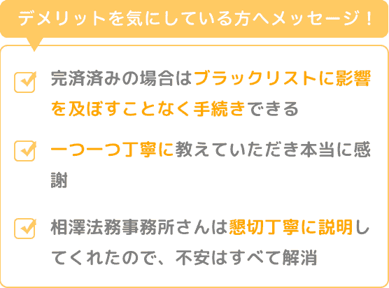 信用調査情報にどんな影響があるのかも全くわからなかったのですが、相澤法務事務所さんは懇切丁寧に説明してくれたので、不安はすべて解消できました。本当にありがとうございました。