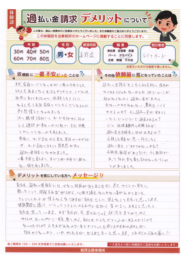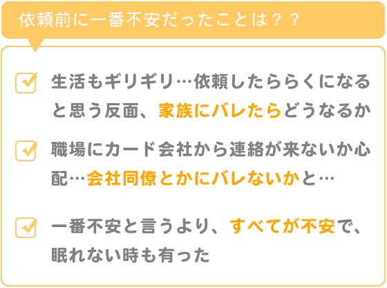 収入もあまりなく生活もギリギリで、こづかいも、返済にあててましたので、依頼したららくになると思う反面、家族にバレたら、どうなるのか色々想像してなやみました。