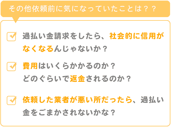 過払い金請求をしたら、社会的に、信用がなくなるんじゃあないかとか、他でローンが組めなくなったり、過払い金がまったく出ないのかも知れない、費用はいくらかかるのか?もし過払い金が発生していたら、どのぐらいで返金されるの?どの法律事務所に依頼すれば、過払い金を効率良く回収出来るか?依頼した業者が、悪い所だったら、過払い金を、ごまかされないかな?依頼後、面談がありそうで、少し抵抗があって何か、変な事を言われないだろうかとかありました。