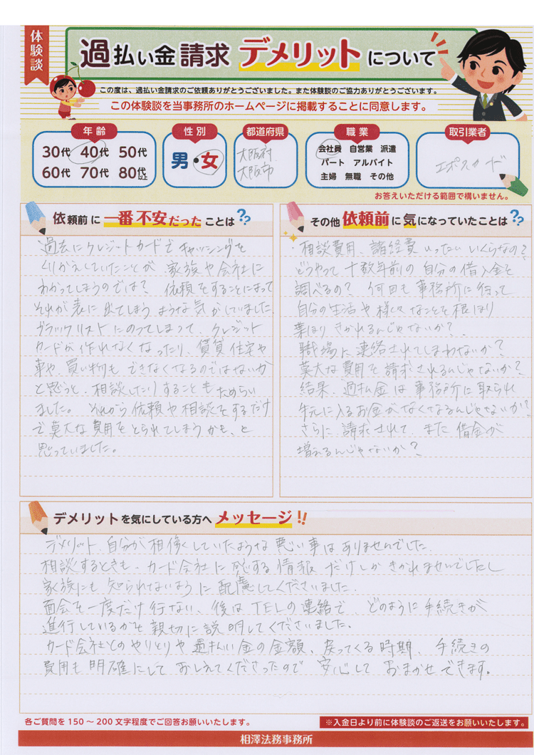 カード会社とのやりとりや過払い金の金額、戻ってくる時期、手続きの費用も明確にしておしえてくださったので安心しておまかせできます。