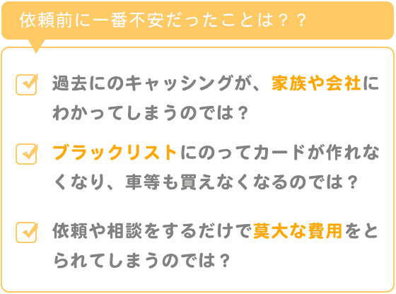 過去にクレジットカードでキャッシングをくりかえしていたことが、家族や会社にわかってしまうのでは?依頼をすることによってそれが表に出てしまうような気がしていました。