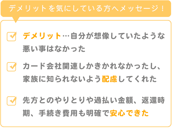 相談するときも、カード会社に関する情報だけしかきかれませんでしたし家族にも知られないように配慮してくださいました。