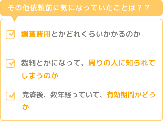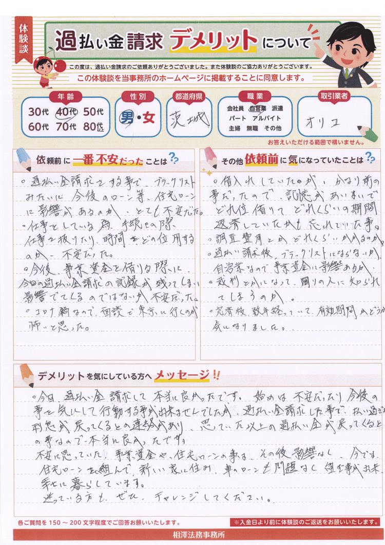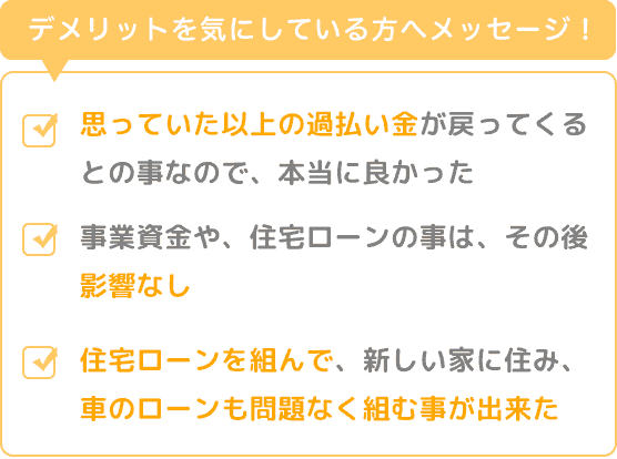 ・今後、事業資金を借りる際に、今回の過払い金請求の記録が残ってしまい影響でてくるのではないか不安だった。