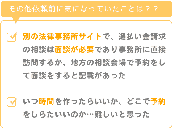 以前、別の法律事務所をネットで見た際、過払い金請求の相談は面談が必要であり事務所に直接訪問するか、地方の相談会場で予約をして面談をすると記載がありました。