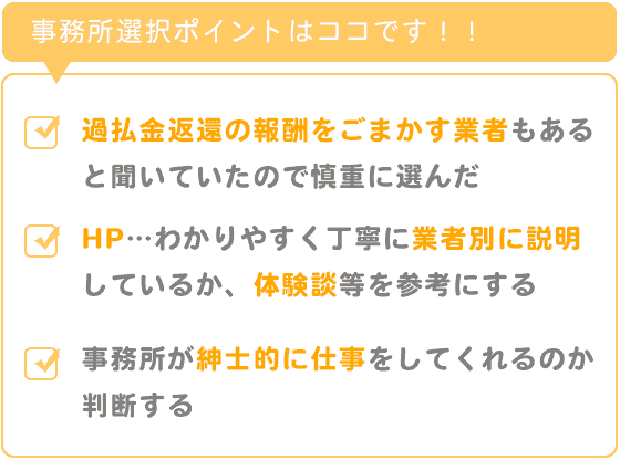 過払金返還の報酬をごまかす業者もあると聞いていたので慎重に選びました。