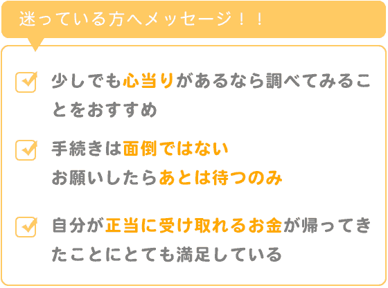 長年苦しめられてきた借金から解放されたこと自分が正当に受け取れるお金が帰ってきたことにとても満足しています。