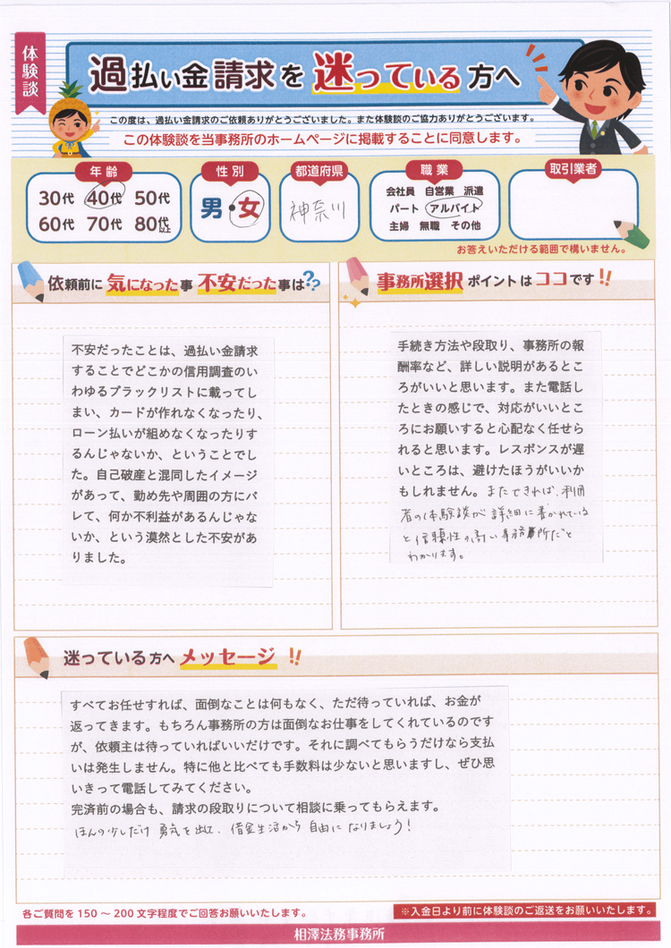 不安だったことは、過払い金請求することでどこかの信用調査のいわゆるブラックリストに載ってしまい、カードが作れなくなったり、ローン払いが組めなくなったりするんじゃないか、ということでした。