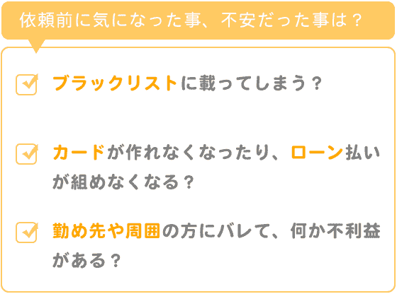 自己破産と混同したイメージがあって、勤め先や周囲の方にバレて、何か不利益があるんじゃないか、という漢然とした不安がありました。