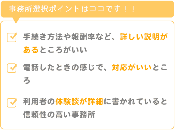 手続き方法や段取り、事務所の報酬率など、詳しい説明があるところがいいと思います。