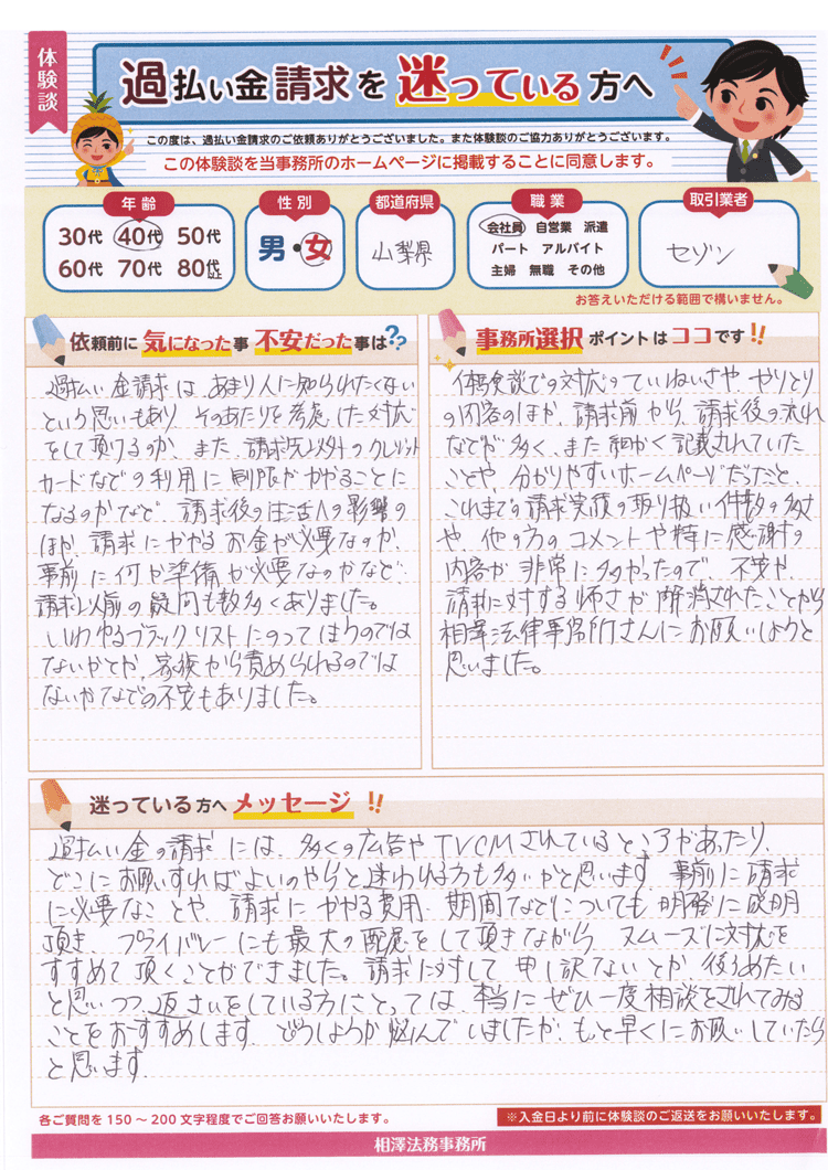 これまでの請求実績の取り扱い件数の多さや、他の方のコメントや特に感謝の内容が非常に多かったので、不安や請求に対する怖さが解消されたことから相澤法律事務所さんにお願いしようと思いました。