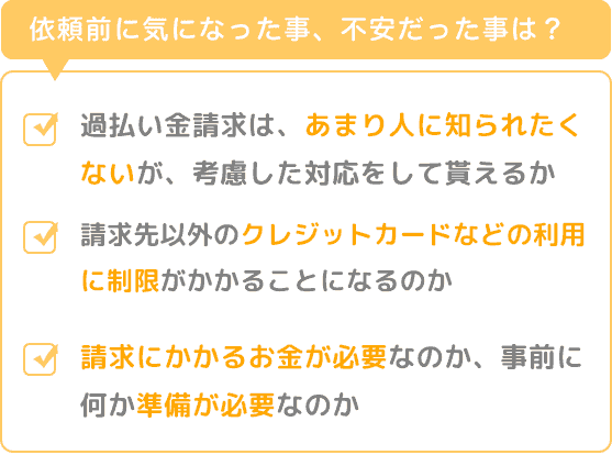 過払い金請求は、あまり人に知られたくないという思いもあり、そのあたりを考慮した対応をして頂けるのか、また、請求先以外のクレジットカードなどの利用に制限がかかることになるのかなど。