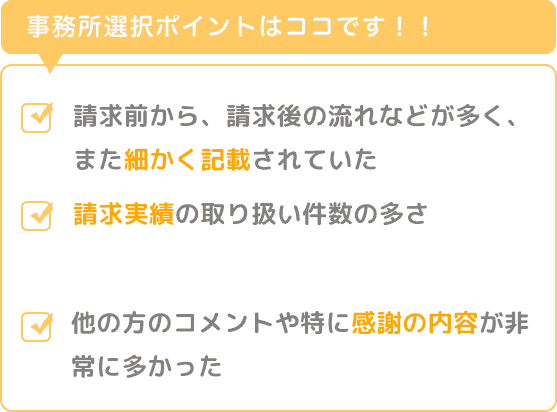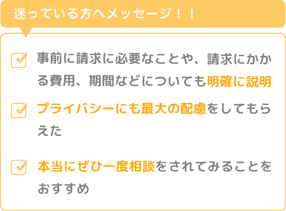 事前に請求に必要なことや、請求にかかる費用、期間などについても明確に説明頂き、プライバシーにも最大の配慮をして頂きながら、スムーズに対応をすすめて頂くことができました。