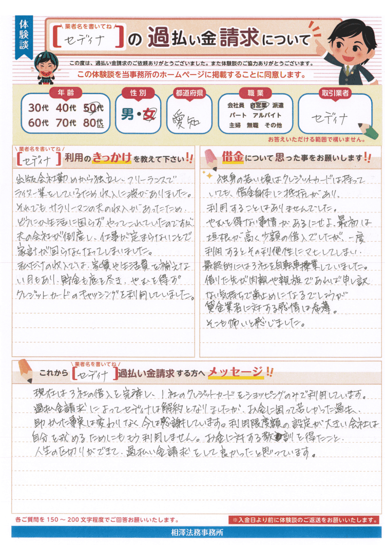 過払金請求によってセディナは解約となりましたが、お金に困って苦しかった過去、助かった事実は変わりなく今は感謝しています。
