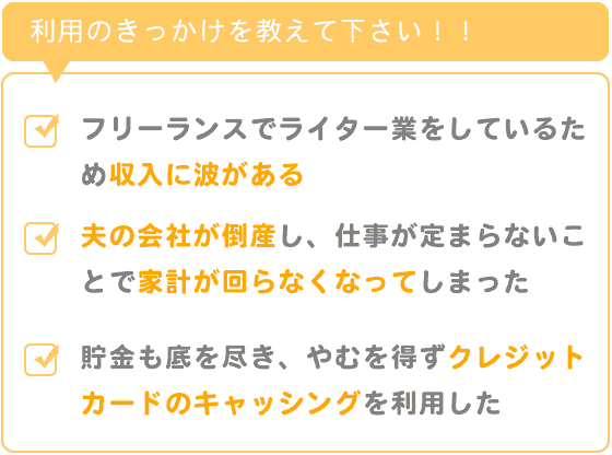 私だけの収入では、家賃や生活費を補えない月もあり、貯金も底を尽き、やむを得ずクレジットカードのキャッシングを利用していました。