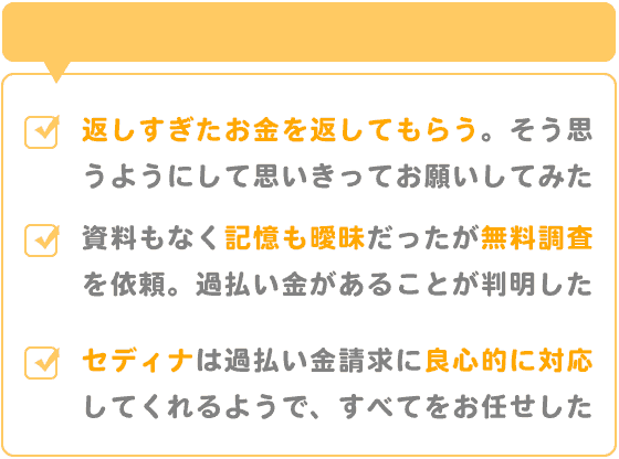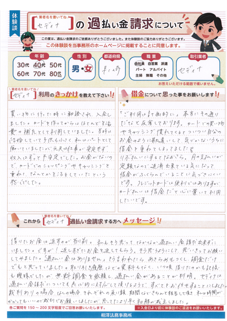 セディナは過払い金請求についても良心的に対応して頂けるようで、すべてをお任せすることにしました。
