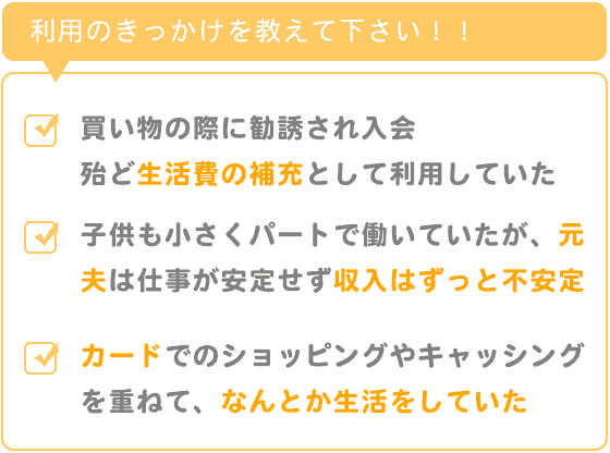 買い物に行った時に勧誘され、入会しました。カードを作ってからはほとんど生活費の補充として利用していました。