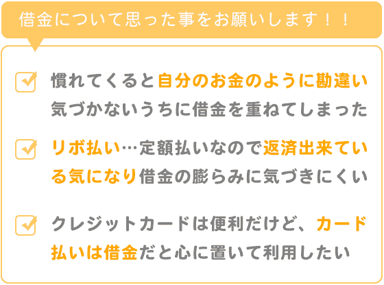 カードでの買い物やキャッシング慣れてくるとついつい自分のお金のように勘違いして、気づかないうちに借金を重ねてしまってました。