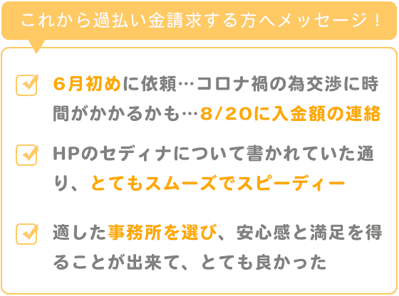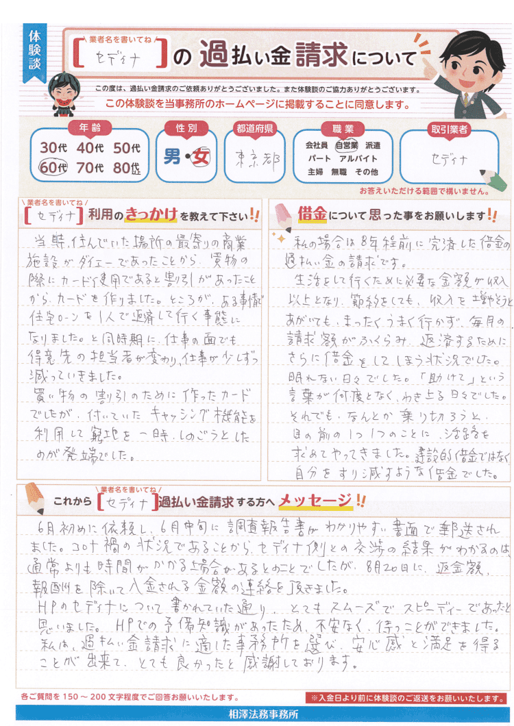 私は、過払い金請求に適した事務所を選び、安心感と満足を得ることが出来て、とても良かったと感謝しております。