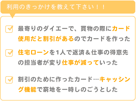 当時、住んでいた場所の最寄りの商業施設がダイエーであったことから、買物の際にカード使用であると割引があったことから、カードを作りました。