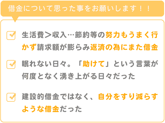 生活をして行くために必要な金額が収入以上となり、節約をしても、収入を増やそうとあがいても、まったくうまく行かず、毎月の請求額がふくらみ、返済するためにさらに借金をしてしまう状況でした。