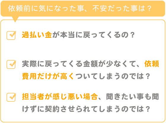 私が依頼する際に一番気になった事は、本当に過払い金が本当に戻ってくるかが分からなかった事です。