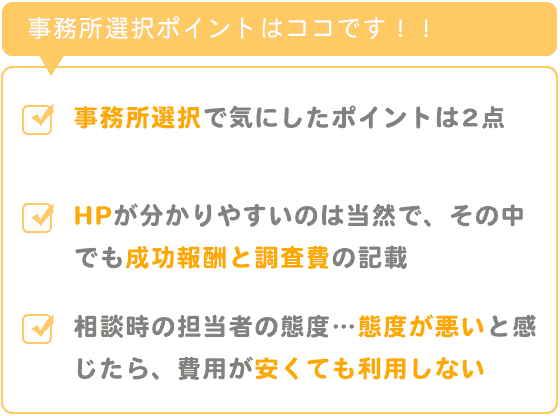 特に担当者の態度が悪いと感じたら、成功報酬や調査費が安くても利用しないと決めていました。