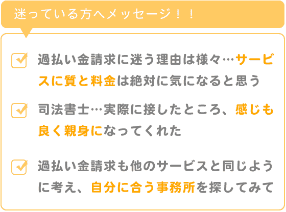 少しでも迷っているなら、過払い金請求も、他のサービスと同じように考え、自分に合った事務所を探してみることをおすすめします。