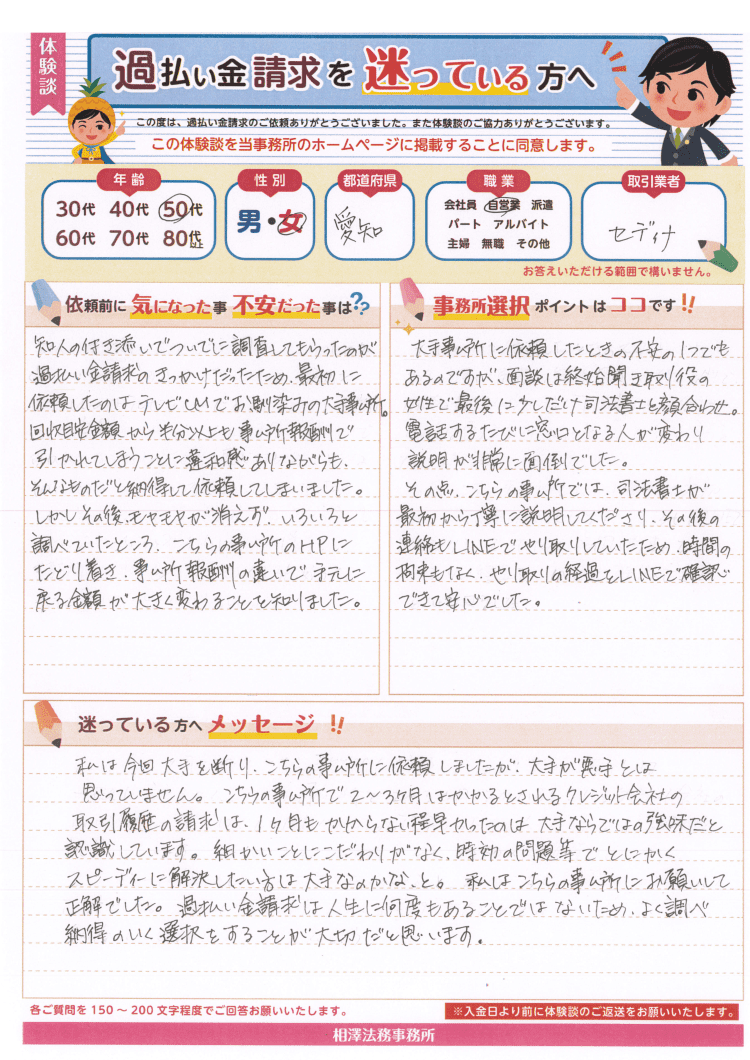 前に依頼した大手とこんなに違う!相澤法務のセディナ過払い回収