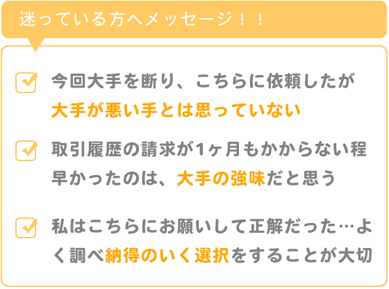 こちらの事ム所で2~3ヶ月はかかるとされるクレジット会社の取引履歴の請求は、1ヶ月もかからない程早かったのは大手ならではの強味だと認識しています。