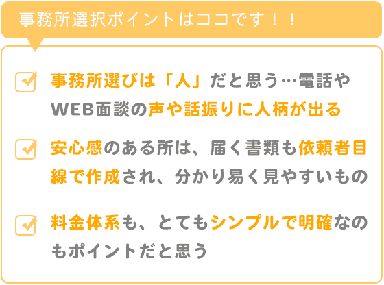 どの事務所に依頼すればよいのか?自力でやれるのか?も、悩んでいたことでした。