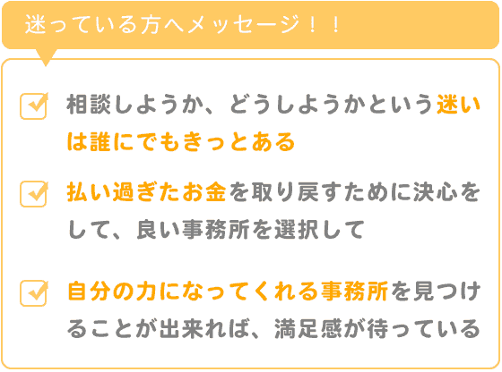 でも、自分の払い過ぎたお金を取り戻すために決心をして、良い事務所を選択して下さい。