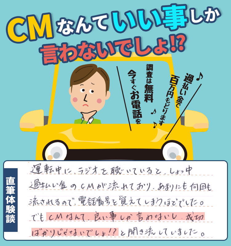 運転中にラジオを聞いていると、しょっ中過払い金のCMが流れており、あまりにも何回も流されるので、電話番号を覚えてしまうほどでした。