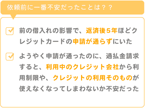 ようやく申請通過したのに、過払金請求を起こす事によって、同じ様な金融機関のクレジット会社から、利用制限や、クレジットの利用そのものが使えなくなってしまわないかとゆう不安が一番でした。