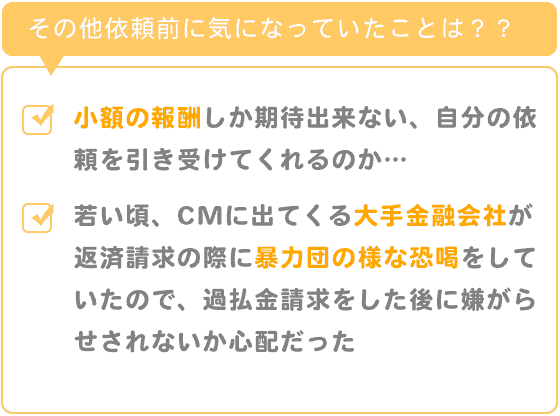 CMでやっている様な多い金額の過払い金請求ではなかったので、法務事務所もボランティアでは無いので小額の報酬しか期待出来ない、自分の依頼を引き受けてくれるのか不安でした。