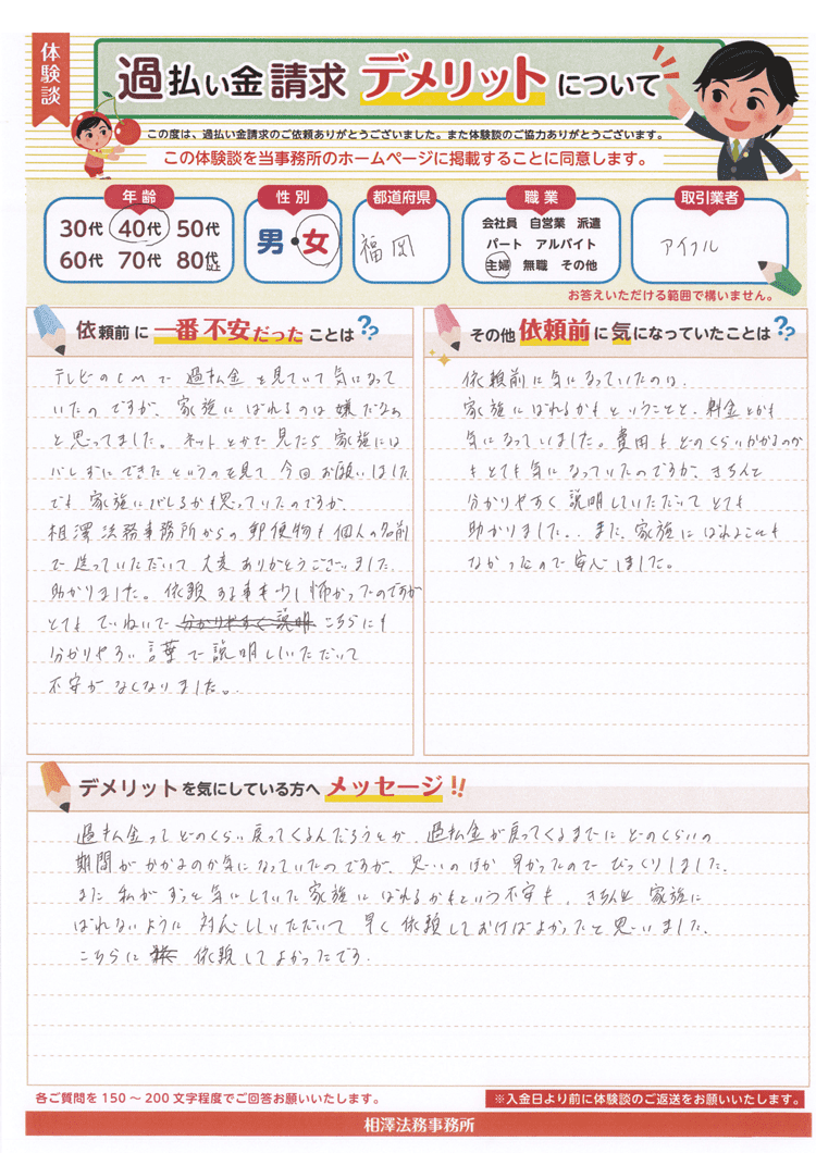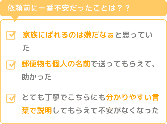 また私がずっと気にしていた家族にばれるかもという不安も、きちんと家族にばれないように対応していただいて早く依頼しておけばよかったと思いました。