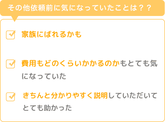 依頼前に気になっていたのは、家族にばれるかもということと、料金とかも気になっていました。