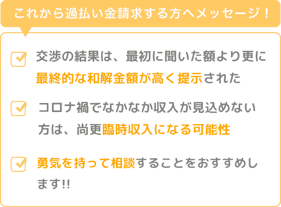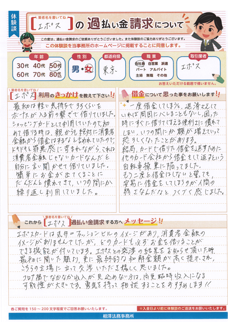 エポスとの交渉の結果をお知らせ頂いた時、最初に聞いた額より、更に最終的な和解金額が高く提示され、こちらの立場に立って交渉いただき嬉しく思いました。