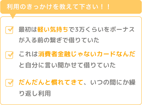 最初は軽い気持ちで3万くらいをボーナスが入る前の繋ぎで借りていました。ショッピングカードとして利用していたので、初めて借りる時は、親からも絶対に消費者金融から借金はするなと言われていたので、ドキドキと罪悪感に苛まれながら、これは消費者金融じゃないカードなんだと自分に言い聞かせて借りていました。