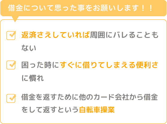 もう二度と借金はしないと誓っても、安易に借金をしてしまうのが人間の弱さなんだなとつくづく感じました。