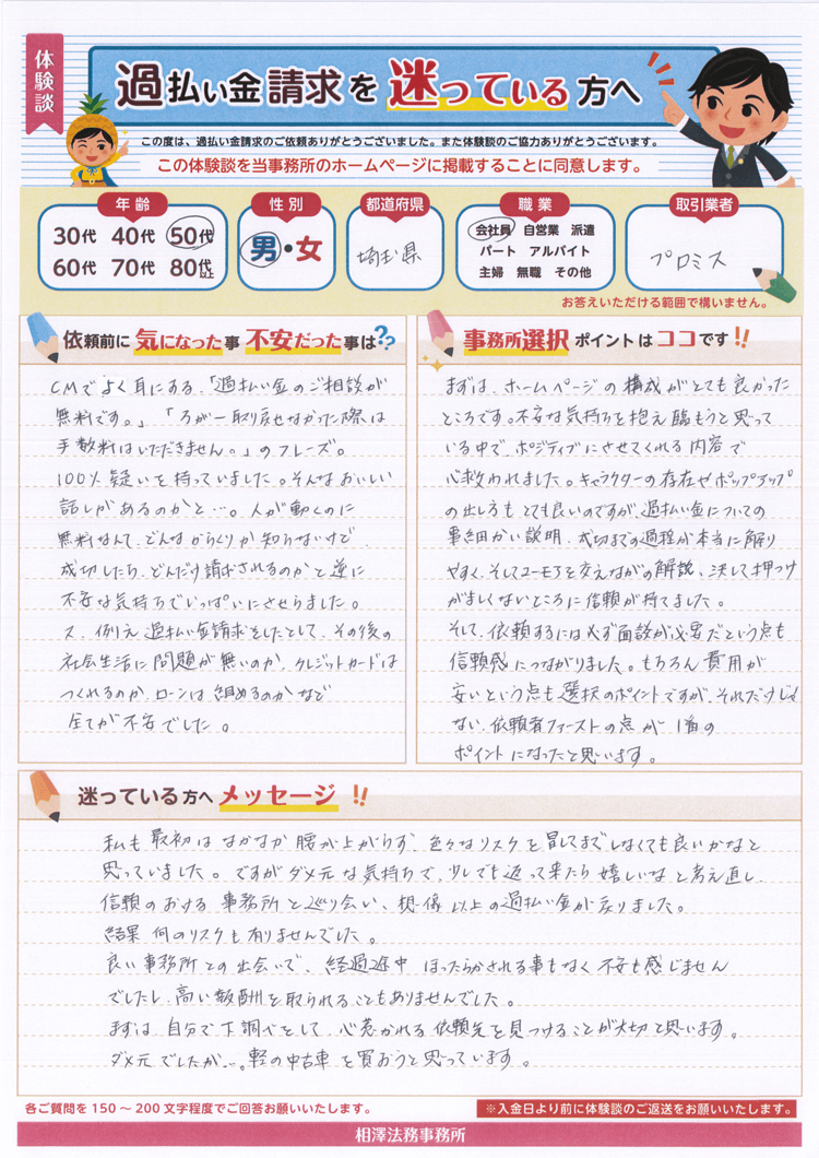 又、例え過払い金請求をしたとして、その後の社会生活に問題が無いのか、クレジットカードはつくれるのか、ローンは組めるのかなど全てが不安でした。