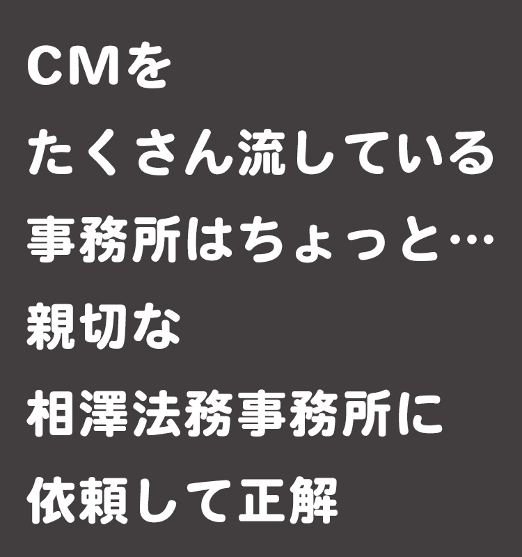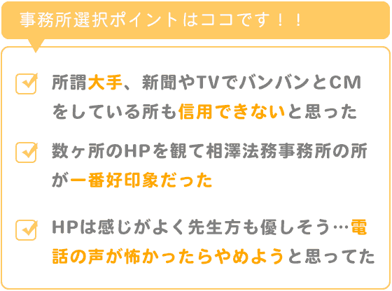 まず自宅から近い方がいいなと思いましたがそれだけでは少々、いやだいぶ不安ですし、私の勝手な思い込みかもしれませんが、いわゆる大手、新聞やテレビでバンバンとコマーシャルをしているようなところも信用できないと思ってました。そこでパソコンを開いてネットで数ヶ所のホームページを観て相澤法務事務所さんの所が一番好印象でした。相澤さんのホームページはとても感じがよく、先生方も優しそうな雰囲気で、自宅からもまあまあ近くて、よし!ここにしようと割とあっさりと気持ちが固まりました。しかし電話の声が怖かったらやめようとも思ってました。