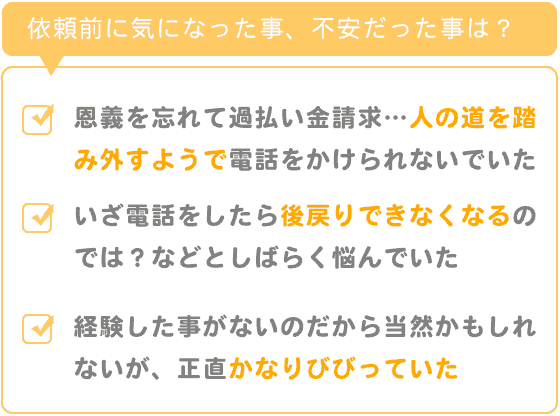 とても日本人的な考え方かもしれないのですがそもそも、人からお金を借りておいて、後からその恩義をすっかりと忘れて、余計に払っていた分を返してくれ!というのも、なんだかとても後ろめたい気持ちでした。大袈裟なようだが人の道を踏み外すようで、なかなか電話をかけられないでいました。さらに、いざ電話をしてしまったら後戻りできなくなって、型にはめられてしまうのではないか?などとしばらく悩んでいました。今おもえば経験した事がないのですから当然かもしれませんが、正直かなりびびってました。
