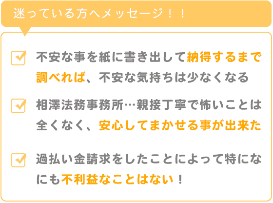 迷うのは当然ですが、その不安に感じている事を全部ひとつひとつ紙に書き出して、そのひとつひとつを自分が納得するまで、調べていけば、不安な気持ちはなくならないにしても少なくなってきます。それから私の場合は友人が過払い金請求をしていたので、それが一番大きかったので、それとなく、あなたの周辺の方々に聞いてみるといいかもしれません、案外と近くに経験者がいるかもしれませんよ。もしも誰もいなくても、相澤法務事務所さんなら親接、丁寧でしたし、怖いことはまったくありませんし安心してまかせる事が出来ましたからおすすめします。それにあくまで今のところはですけど過払い金請求をしたことによって特になにも不利益なことはありません!