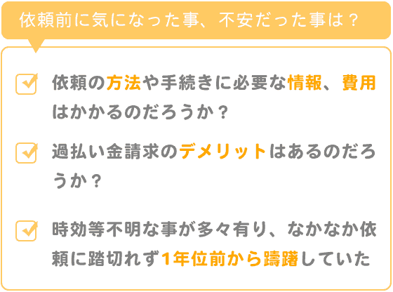 時効等不明な箇所が多々有り、ついつい億劫になってしまい、なかなか依頼に踏切れないで1年位前から躊躇していました。