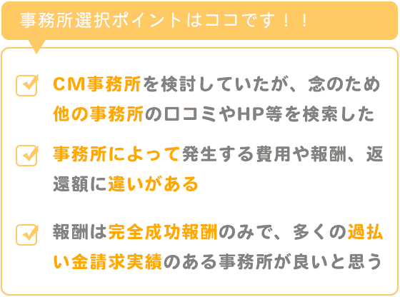 いろいろと確認していると事務所によって発生する費用に違いがあり、過払い金が発生した場合に完全成功報酬のみの事務所、着手金、基本報酬等有りの事務所などがあり手元に戻ってくる金額に違いが出てくる事、場合によっては支払いだけが発生する事があるという事を知りました。