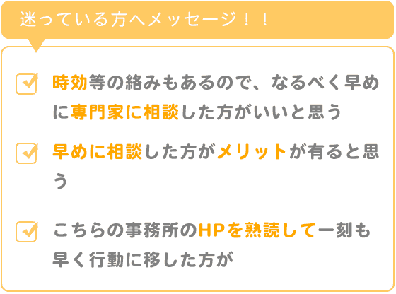 こちらの事務所のホームページを熟読したうえで一刻も早く行動に移した方がよろしいかと思います。