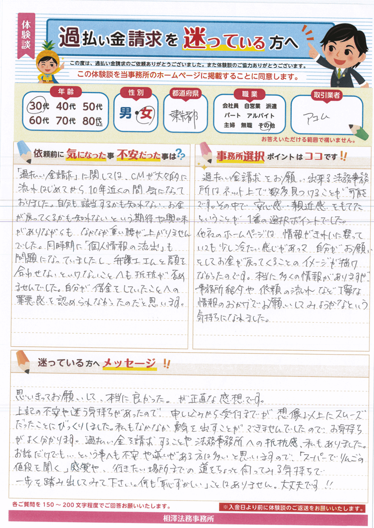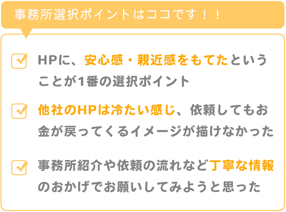 他社のホームページは情報がきれいに整っていても少し冷たい感じがあって自分がお願いをしてお金が戻ってくることのイメージが描けなかったのです。