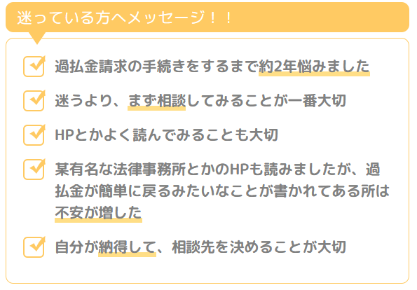 私も過払金請求の手続きをするまで約2年悩みました。まず何をどうしたらよいのかわからなかったから、いつかやればいい…と。