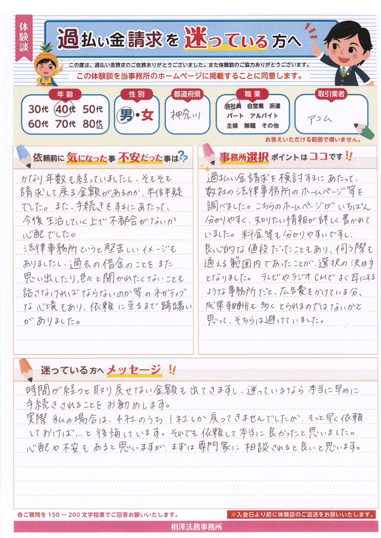 法律事務所というと堅苦しいイメージもありましたし、過去の借金のことをまた思い出したり、色々と聞かれたくないことも話さなければならないのか等のネガティブな心境もあり、依頼に至るまで躊躇いがありました。